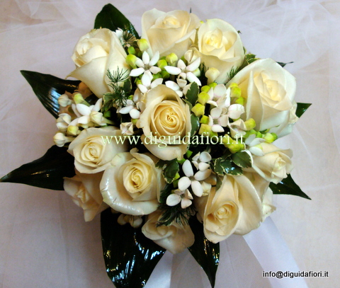 La sposa Valeria ha scelto un bouquet da sposa classico, con rose panna (vendela) e bovardia bianca. La forma del bouquet da sposa è rotonda a mezza sfera, semplice,  ma molto elegante.