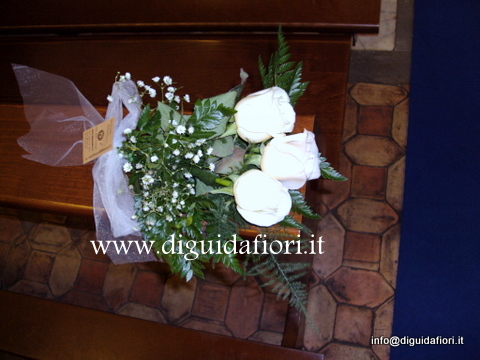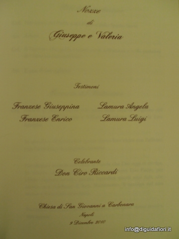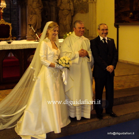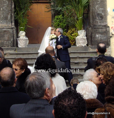 La celebrazione del loro matrimonio, si è svolta nella antichissima chiesa di “San Giovanni a Carbonara”,  nel centro storico di Napoli,  fondata nel 1343, quindi la chiesa necessitava di un addobbo di fiori classico e semplice , esaltando la bellezza dalle statue e affreschi presenti in chiesa. L’addobbo di fiori in chiesa è stato composto da due composizioni di rose panna in cornucopie di vimini arricchite da tralci di radice di colore bianco e di una piccola composizione floreale sull’ altare sempre con rose panna  ( rosa vendela).  addobbo per matrimonio